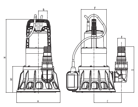 Особенности. Уплотнение вала — масляная камера с двумя сальниковыми уплотнениями. Двигатели оборудованы встроенными конденсаторами и тепловыми выключателями. Модели дополнительно оборудованы поплавковыми выключателями.